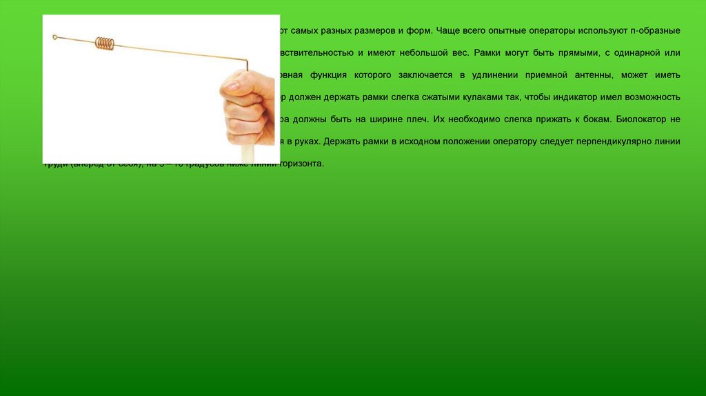 конусообразную или цилиндрическую форму. Оператор должен держать рамки слегка сжатыми кулаками так, чтобы индикатор имел возможность