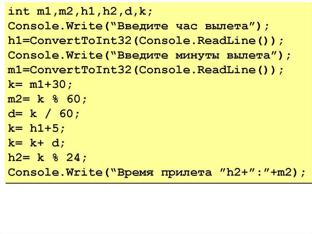 Console.Write(“Время прилета ”h2+”:”+m2);