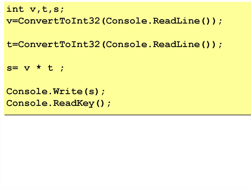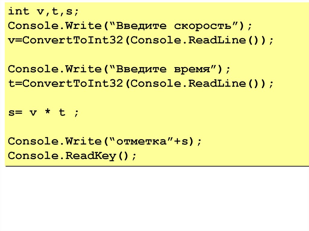 int v,t,s;Console.Write(“Введите скорость”);