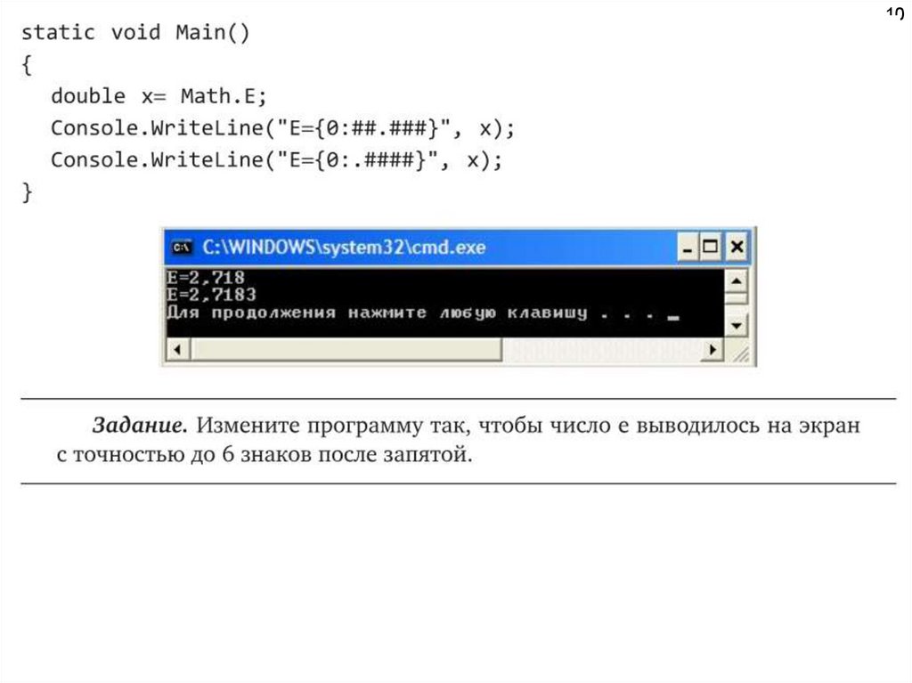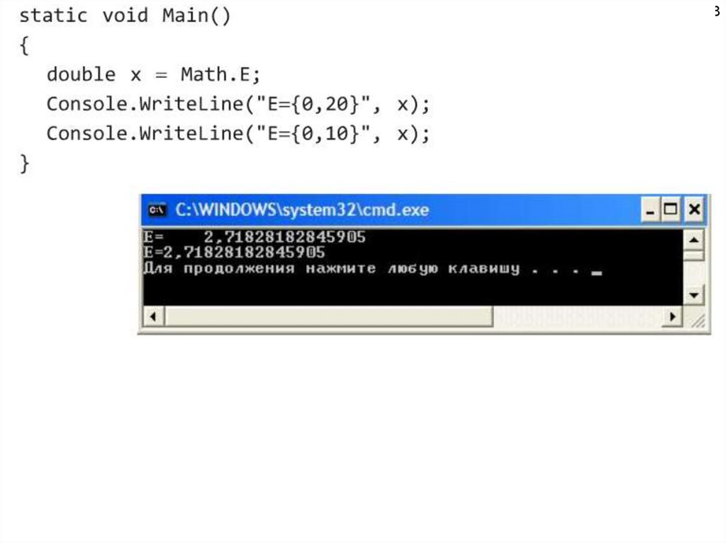 Первым аргументом указывается строкавида {n:##.###} – где n определяет номер