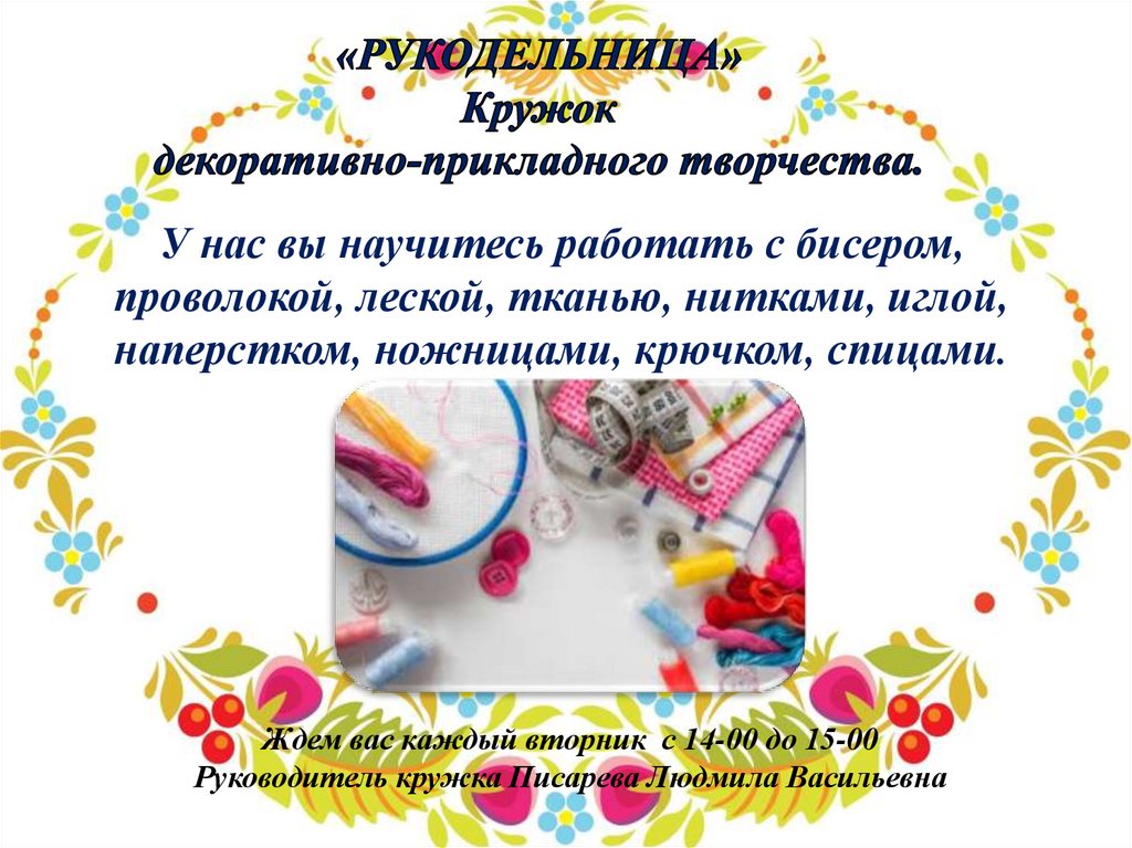 У нас вы научитесь работать с бисером,проволокой, леской, тканью, нитками, иглой,