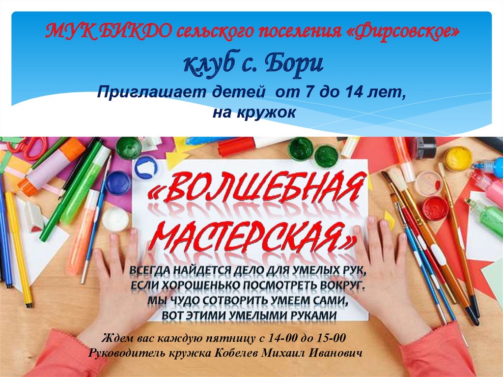 МУК БИКДО сельского поселения Фирсовское клуб с. Бори, приглашает детей от 7 до 14 лет записаться на кружки
