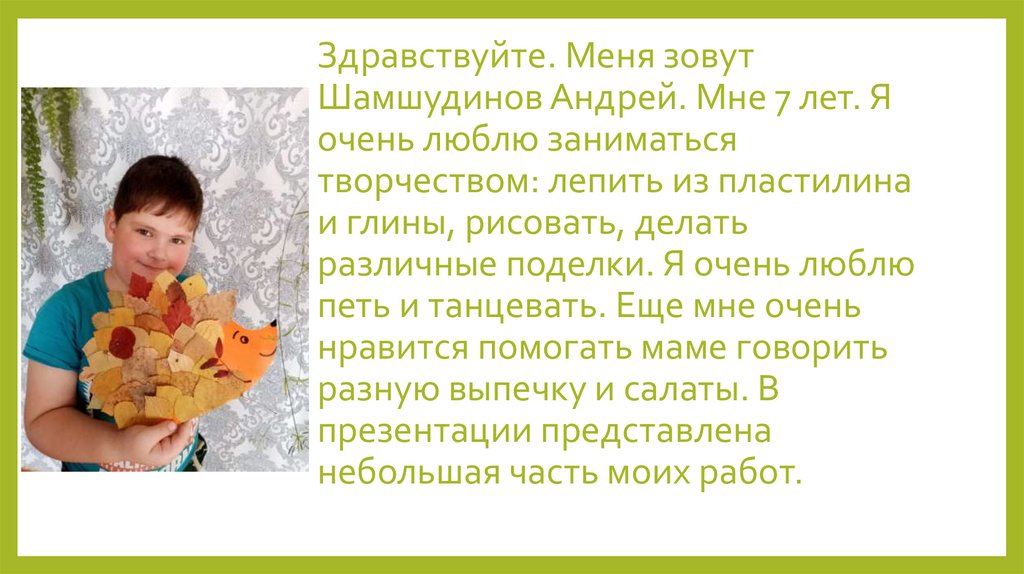 Здравствуйте. Меня зовутШамшудинов Андрей. Мне 7 лет. Я