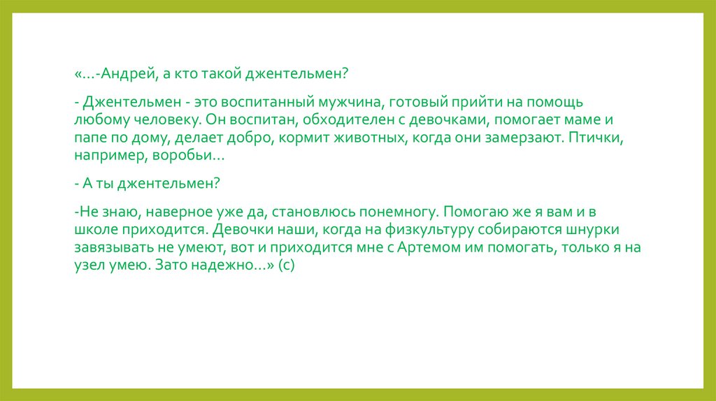«…-Андрей, а кто такой джентельмен?- Джентельмен - это воспитанный мужчина, готовый прийти на помощь