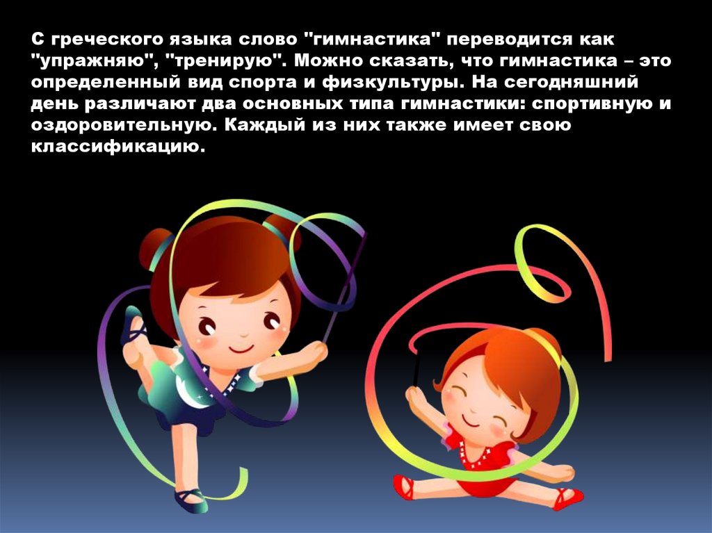 С греческого языка слово "гимнастика" переводится как"упражняю", "тренирую". Можно сказать, что гимнастика – это