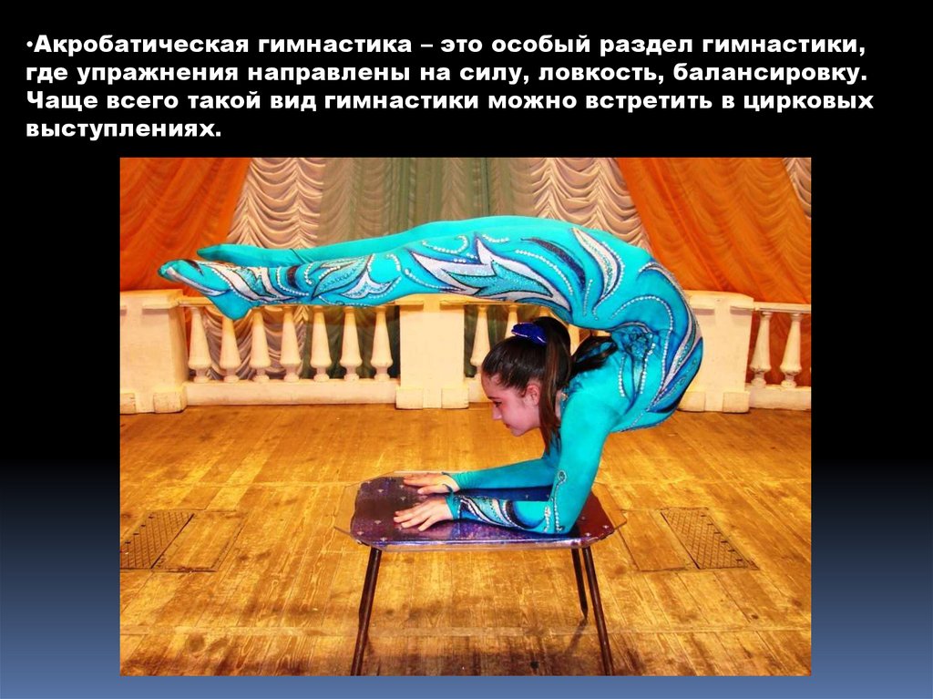 •Акробатическая гимнастика – это особый раздел гимнастики,где упражнения направлены на силу, ловкость, балансировку.
