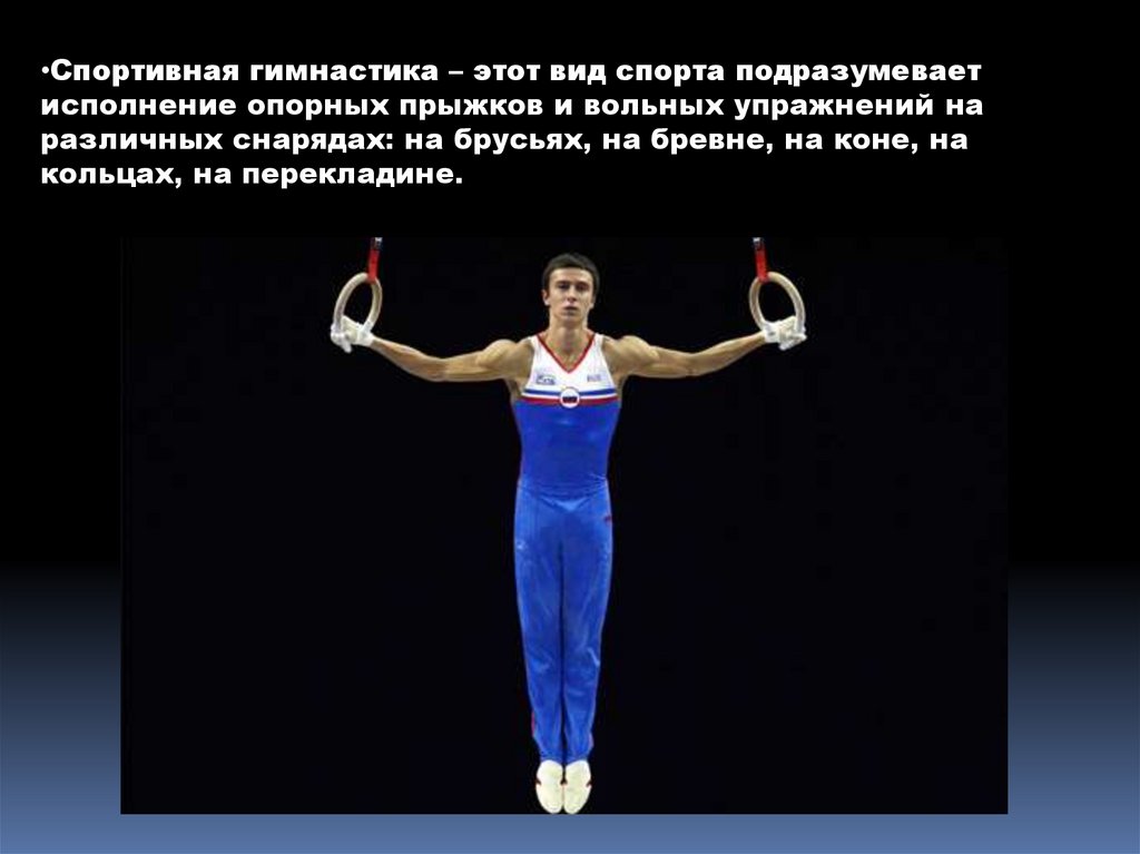 •Спортивная гимнастика – этот вид спорта подразумеваетисполнение опорных прыжков и вольных упражнений на