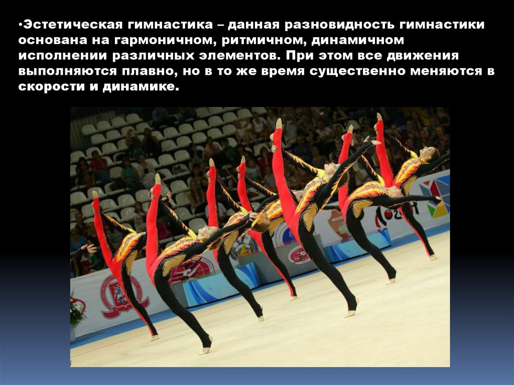 •Эстетическая гимнастика – данная разновидность гимнастикиоснована на гармоничном, ритмичном, динамичном