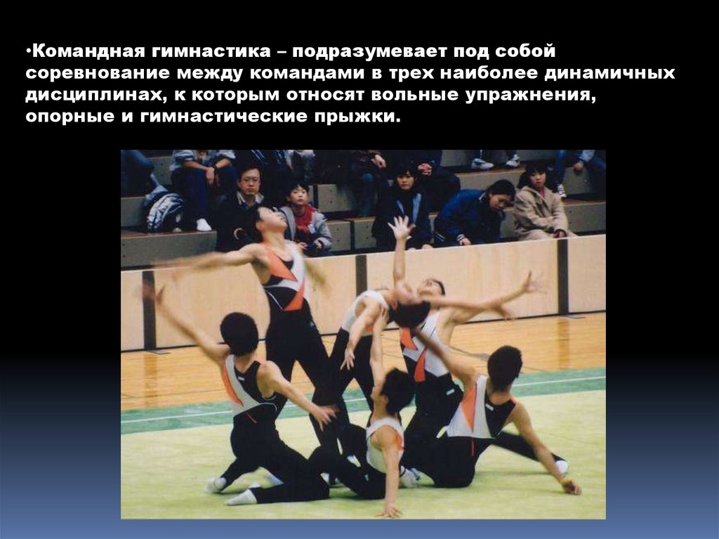 •Командная гимнастика – подразумевает под собойсоревнование между командами в трех наиболее динамичных