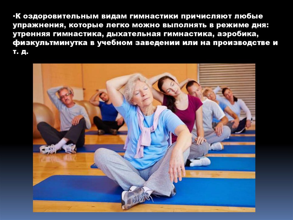 •К оздоровительным видам гимнастики причисляют любыеупражнения, которые легко можно выполнять в режиме дня: