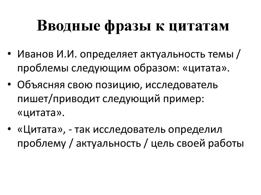 Вводные фразы к цитатам• Иванов И.И. определяет актуальность темы /