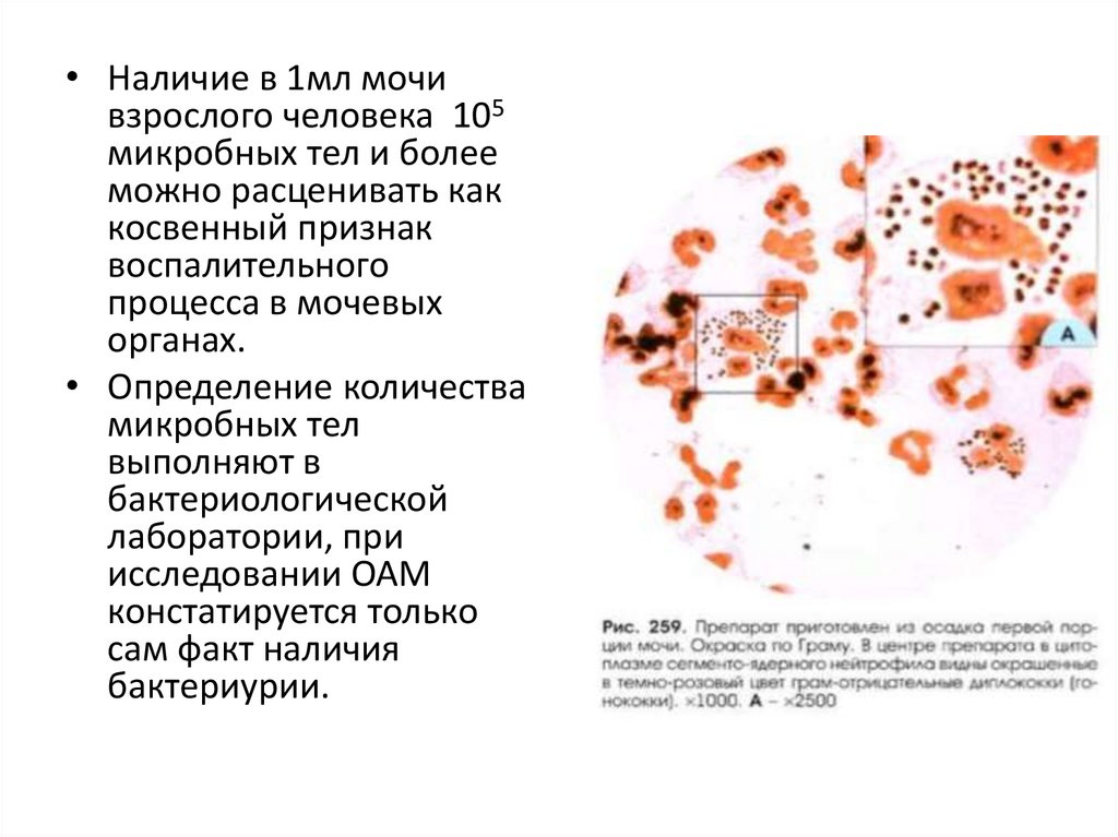 • Наличие в 1мл мочивзрослого человека 105