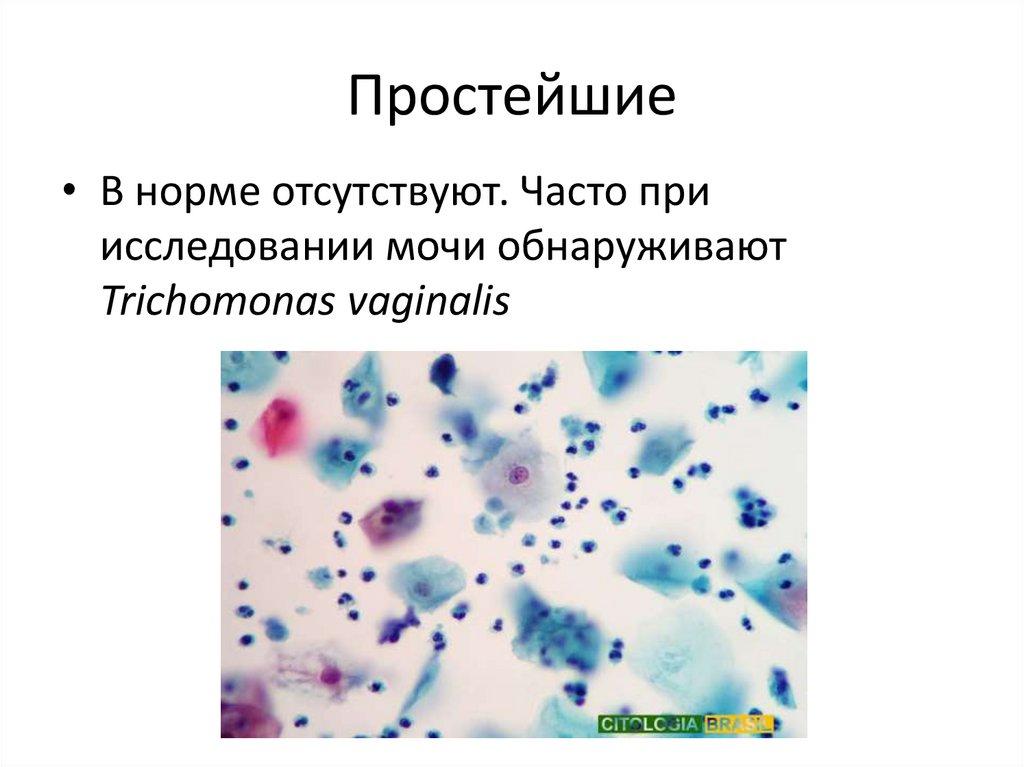 Простейшие• В норме отсутствуют. Часто при