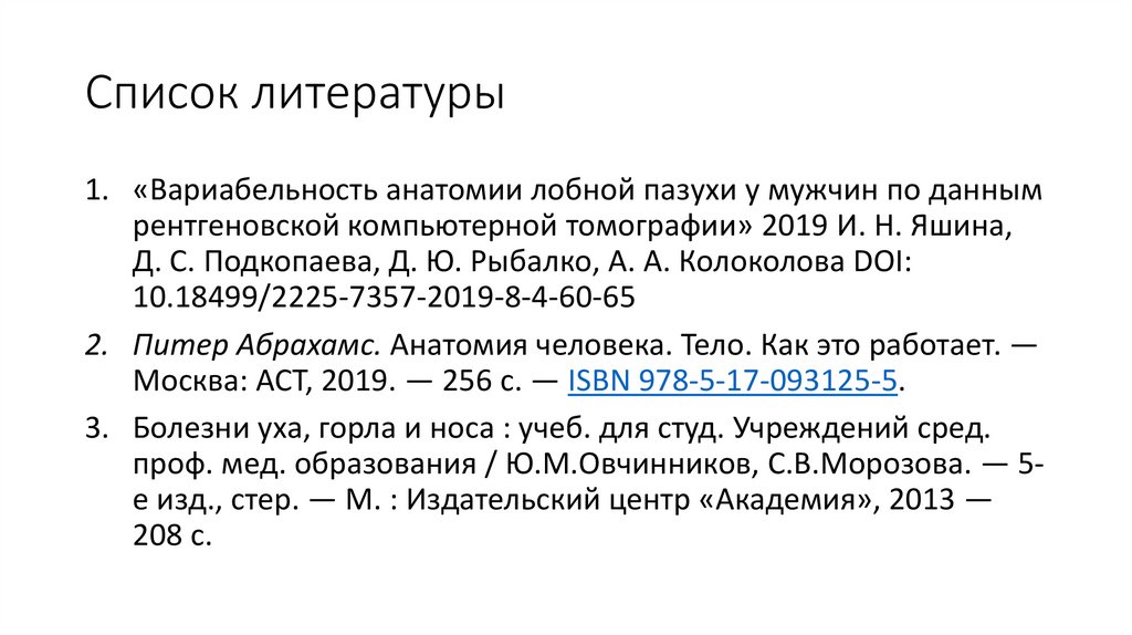 Список литературы1. «Вариабельность анатомии лобной пазухи у мужчин по данным