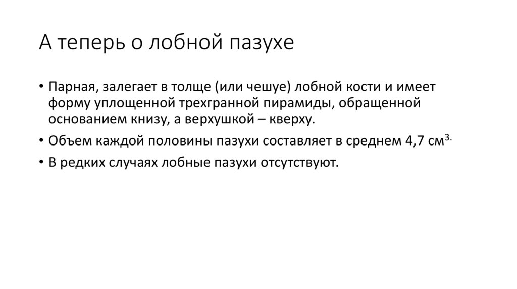 А теперь о лобной пазухе• Парная, залегает в толще (или чешуе) лобной кости и имеет