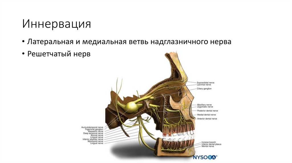 Иннервация• Латеральная и медиальная ветвь надглазничного нерва