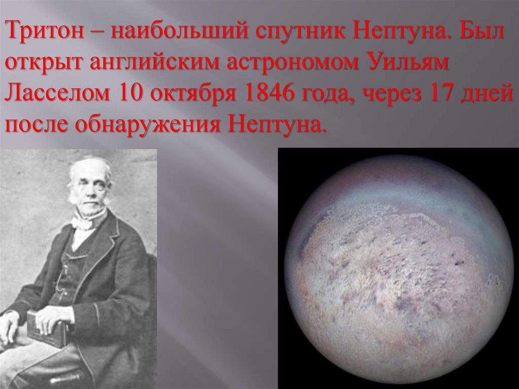 Тритон – наибольший спутник Нептуна. Былоткрыт английским астрономом Уильям