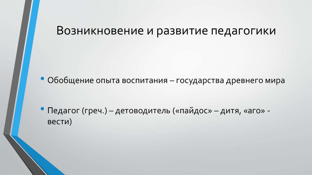 Возникновение и развитие педагогики• Обобщение опыта воспитания – государства древнего мира