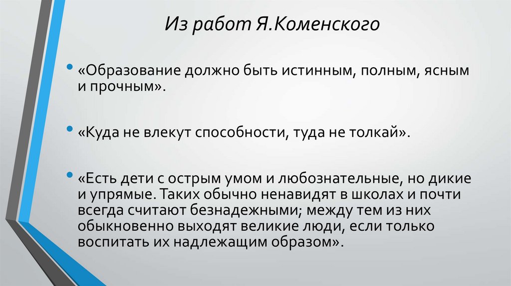 Из работ Я.Коменского• «Образование должно быть истинным, полным, ясным