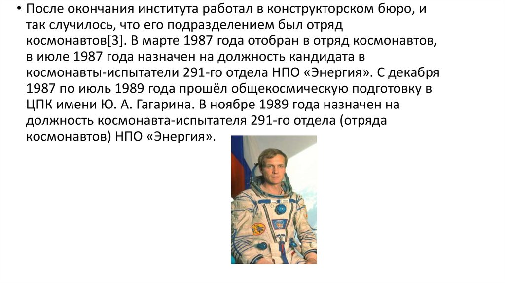 космонавтов[3]. B марте 1987 года отобран в отряд космонавтов,