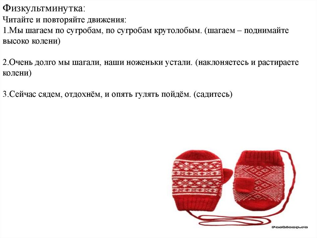 1.Мы шагаем по сугробам, по сугробам крутолобым. (шагаем – поднимайте