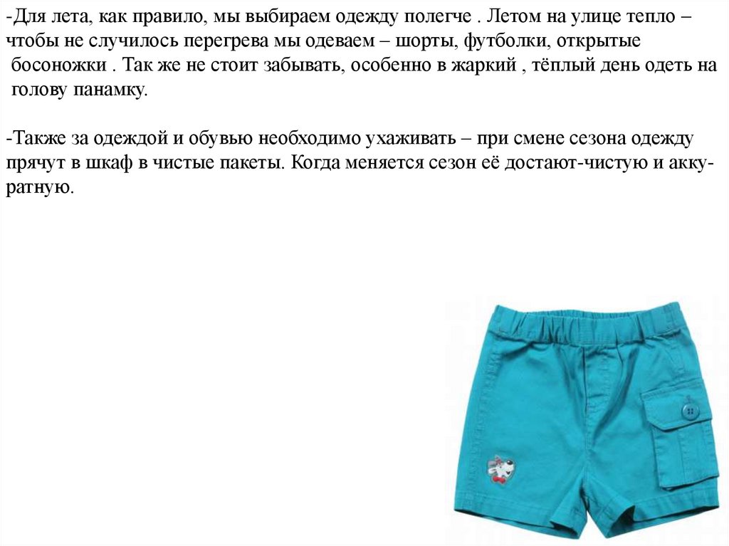 -Для лета, как правило, мы выбираем одежду полегче . Летом на улице тепло –чтобы не случилось перегрева мы одеваем – шорты, футболки, открытые