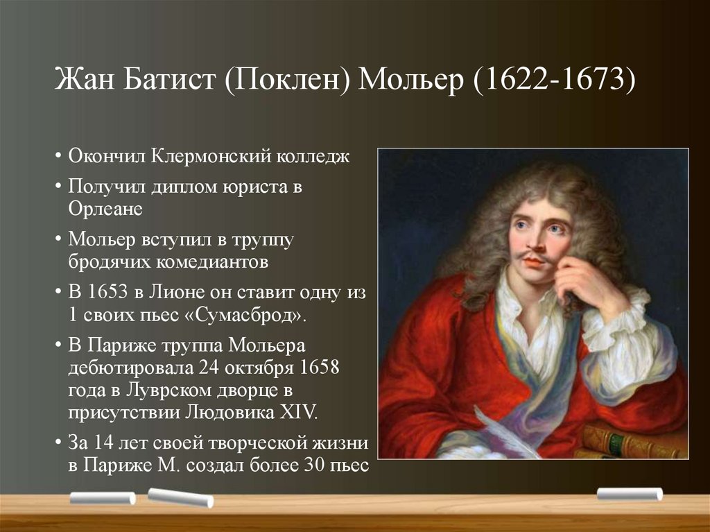 Жан Батист (Поклен) Мольер (1622-1673)• Окончил Клермонский колледж