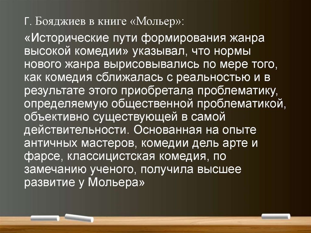 Г. Бояджиев в книге «Мольер»:«Исторические пути формирования жанра