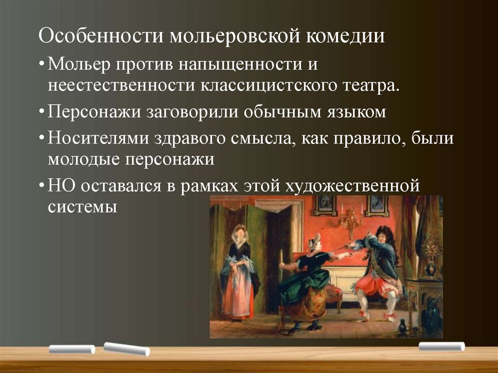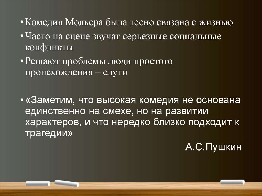 • Комедия Мольера была тесно связана с жизнью• Часто на сцене звучат серьезные социальные
