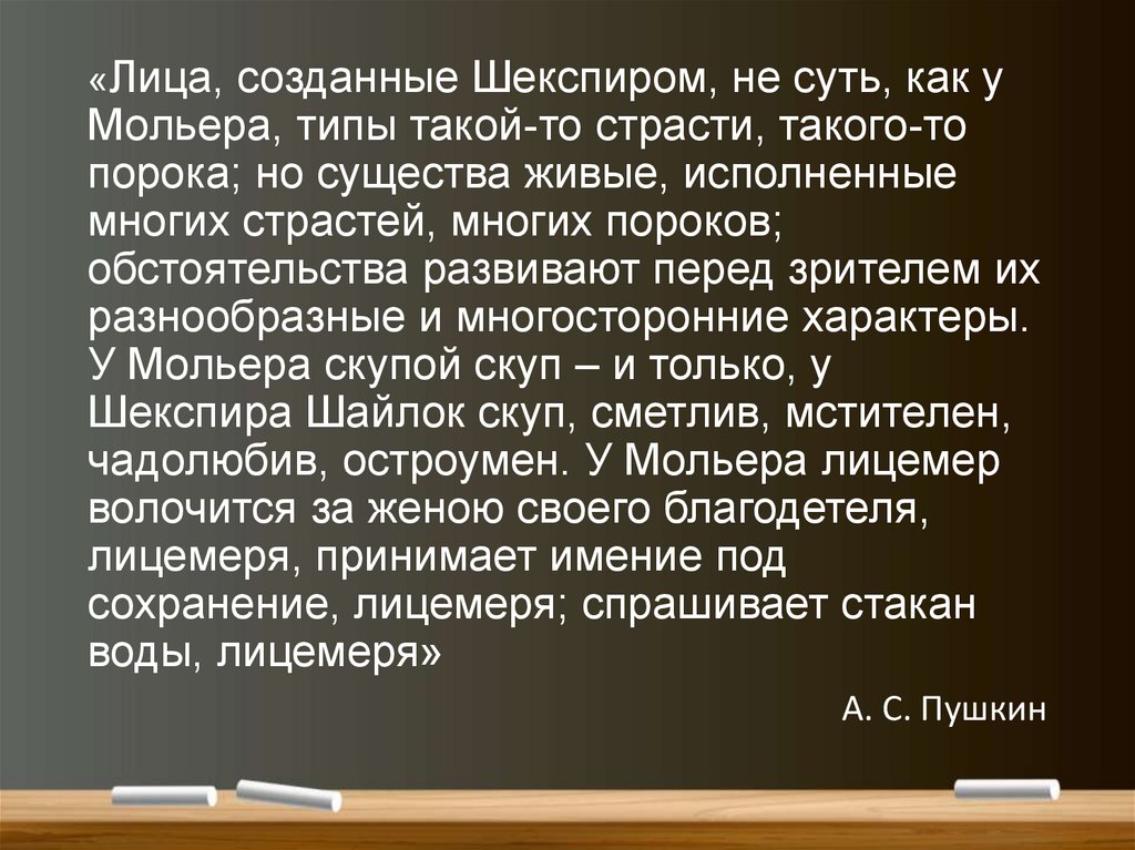 «Лица, созданные Шекспиром, не суть, как уМольера, типы такой-то страсти, такого-то