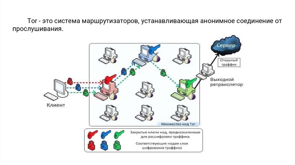 Tor - это система маршрутизаторов, устанавливающая анонимное соединение отпрослушивания.