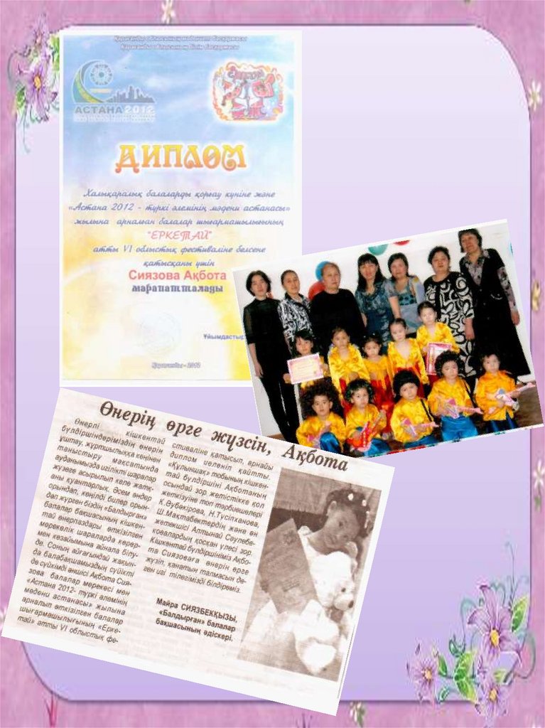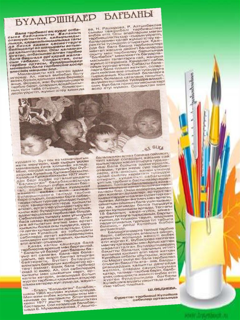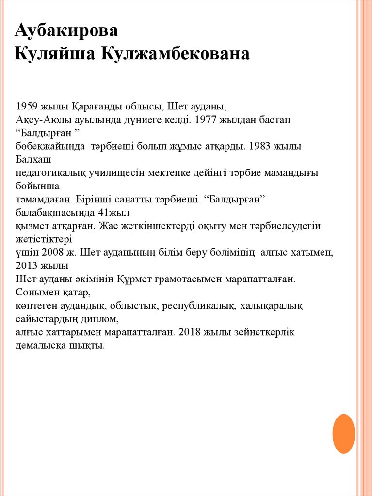 тәмамдаған. Бірінші санатты тәрбиеші. “Балдырған”