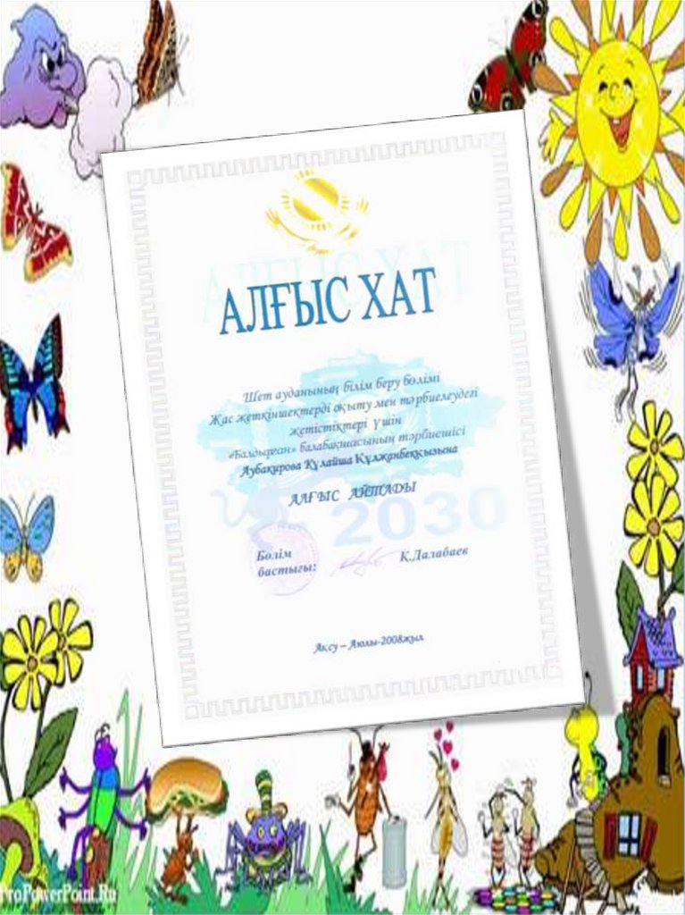 үшін 2008 ж. Шет ауданының білім беру бөлімінің алғыс хатымен,