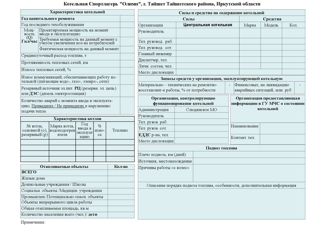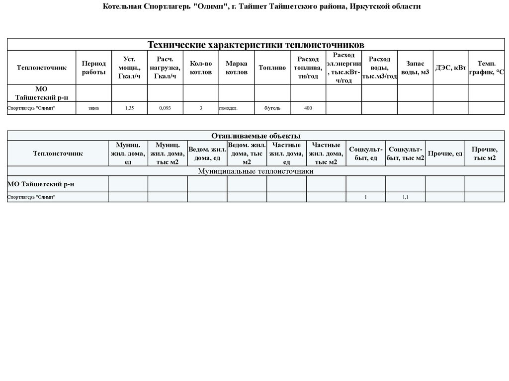 Котельная Спортлагерь "Олимп", г. Тайшет Тайшетского района, Иркутской областиТехнические характеристики теплоисточников