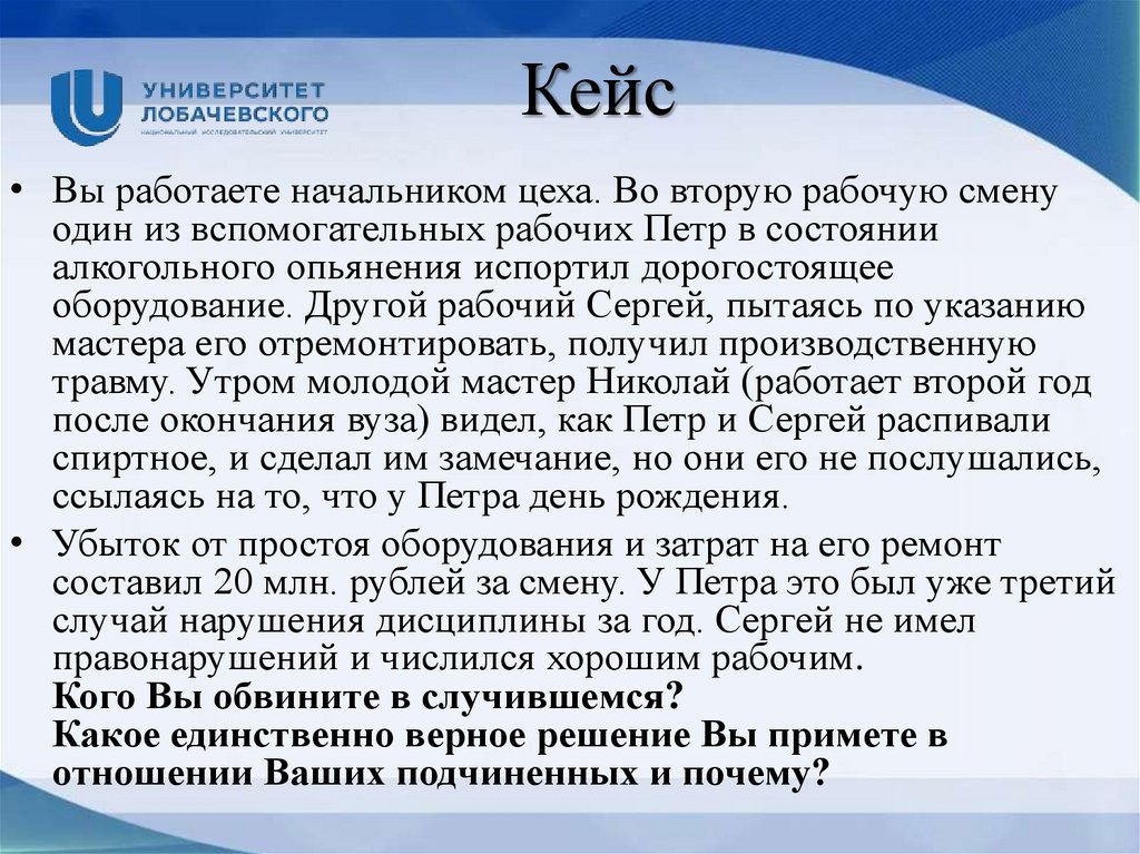 Кейс• Вы работаете начальником цеха. Во вторую рабочую смену