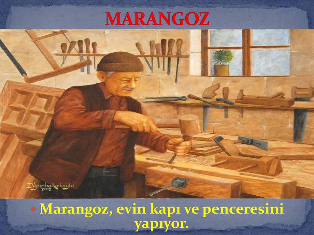 Marangoz, evin kapı ve penceresiniyapıyor.