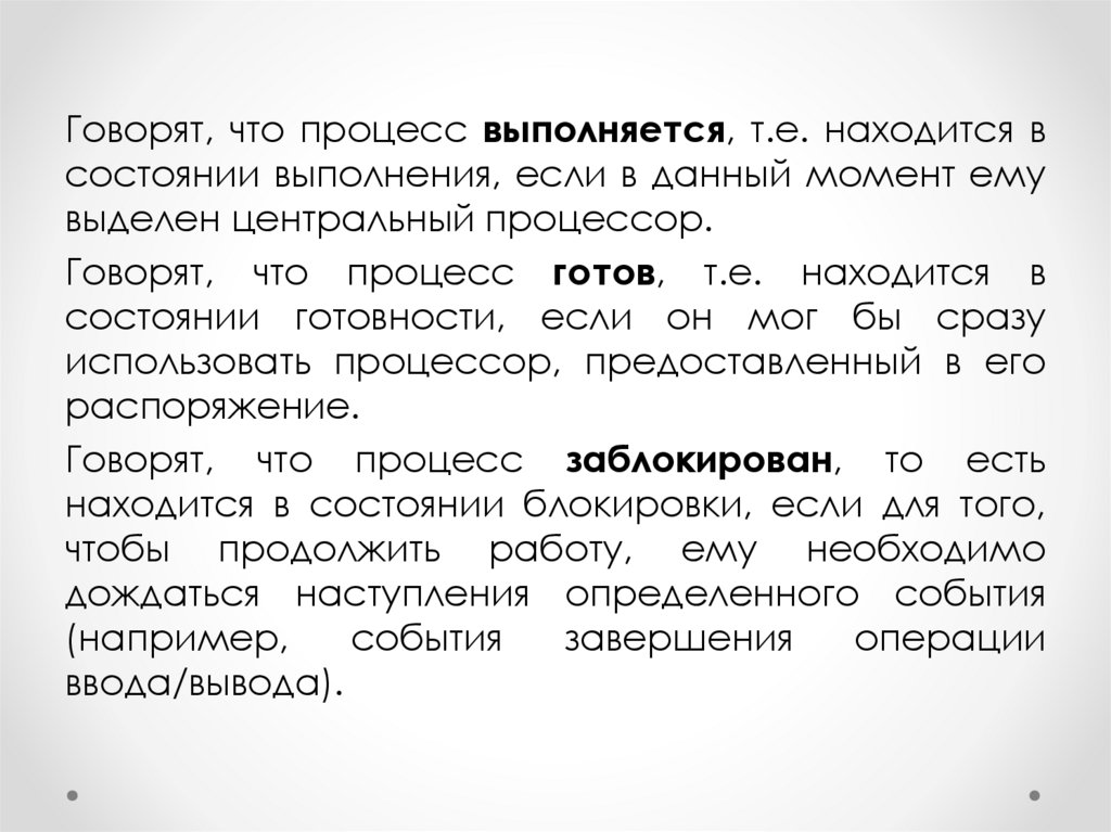Говорят, что процесс выполняется, т.е. находится всостоянии выполнения, если в данный момент ему