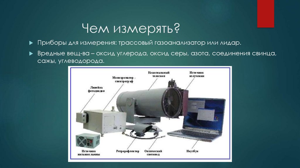 Чем измерять?Приборы для измерения: трассовый газоанализатор или лидар.
