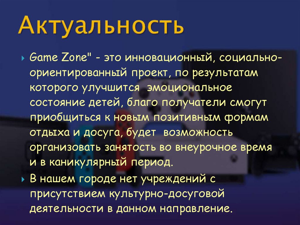 Game Zone" - это инновационный, социальноориентированный проект, по результатамкоторого улучшится эмоциональное