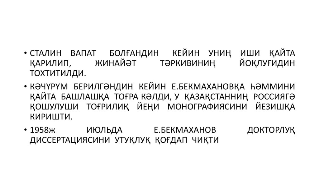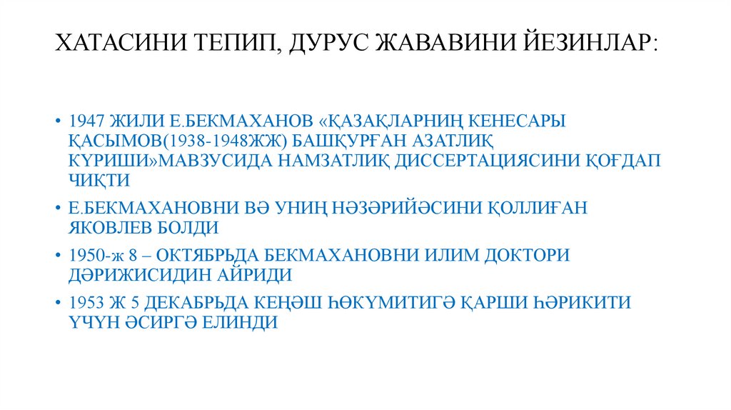 ХАТАСИНИ ТЕПИП, ДУРУС ЖАВАВИНИ ЙЕЗИНЛАР:• 1947 ЖИЛИ Е.БЕКМАХАНОВ «ҚАЗАҚЛАРНИҢ КЕНЕСАРЫ