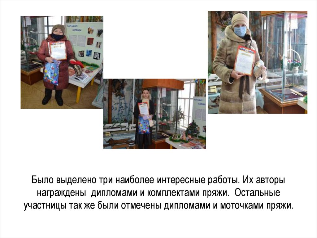 Было выделено три наиболее интересные работы. Их авторынаграждены дипломами и комплектами пряжи. Остальные