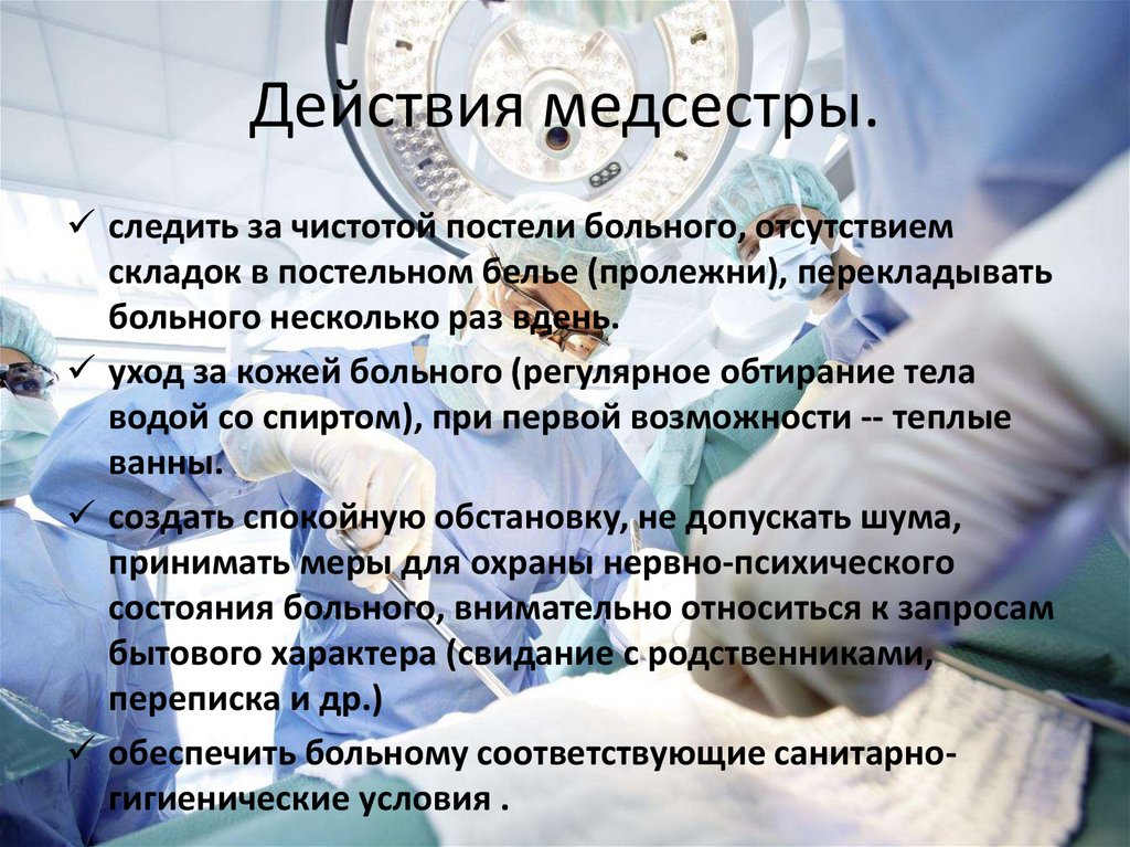 Действия медсестры.следить за чистотой постели больного, отсутствием