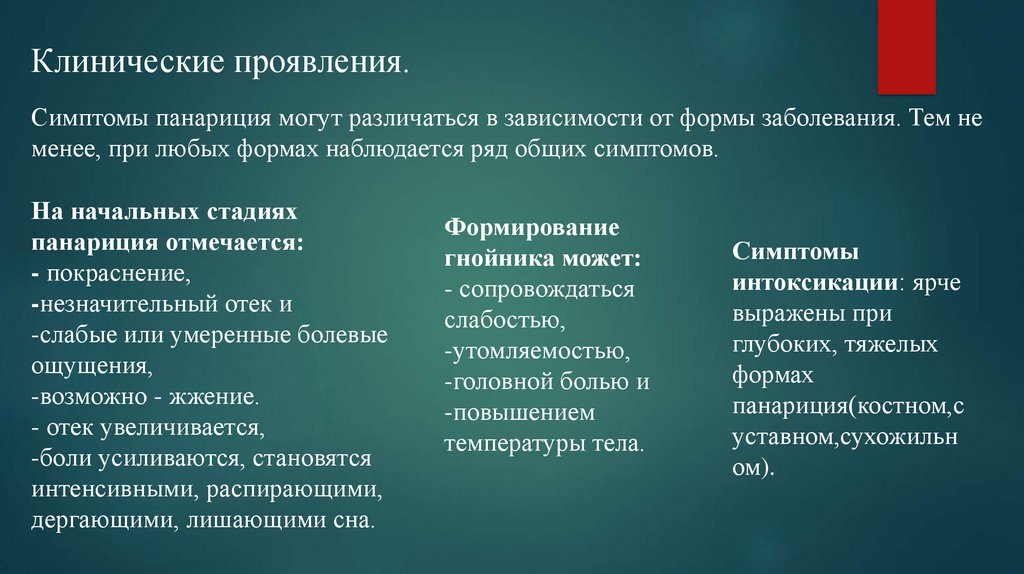 Клинические проявления.Симптомы панариция могут различаться в зависимости от формы заболевания. Тем не