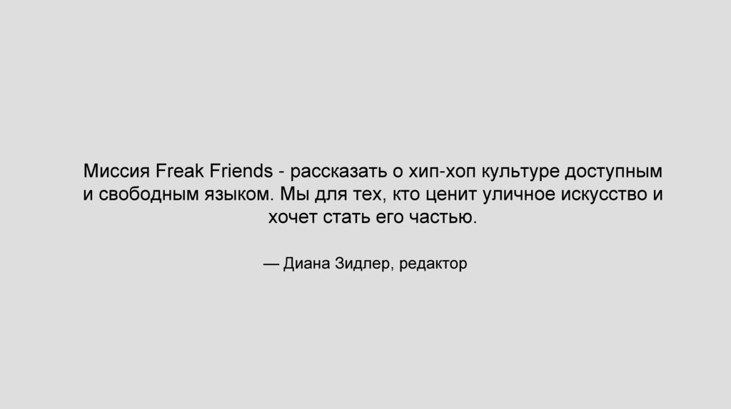 Миссия Freak Friends - рассказать о хип-хоп культуре доступными свободным языком. Мы для тех, кто ценит уличное искусство и