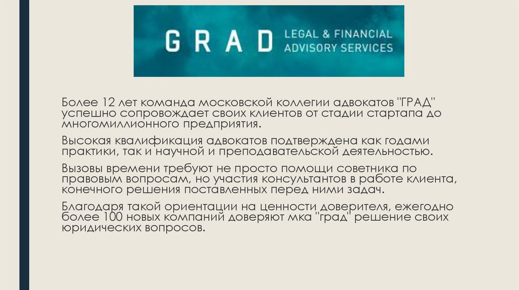 Более 12 лет команда московской коллегии адвокатов "ГРАД"успешно сопровождает своих клиентов от стадии стартапа до