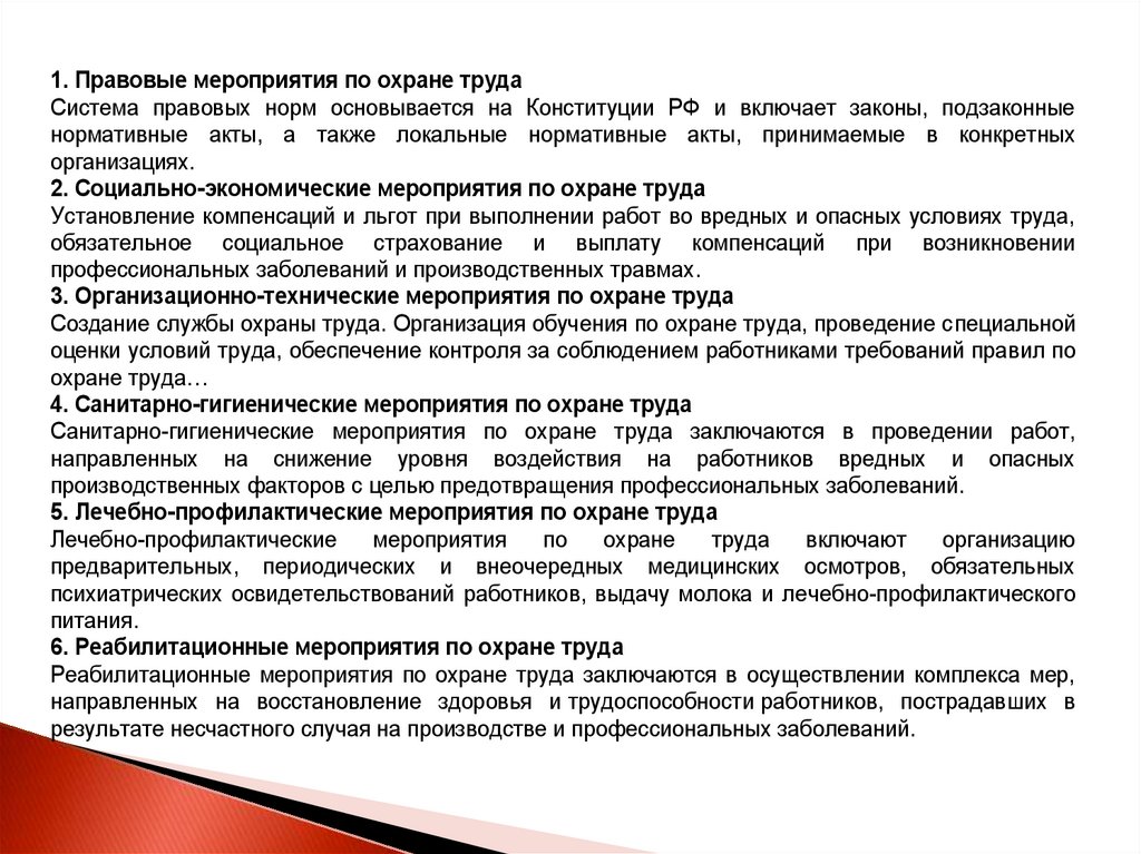 Реабилитационные мероприятия по охране труда заключаются в осуществлении комплекса мер,