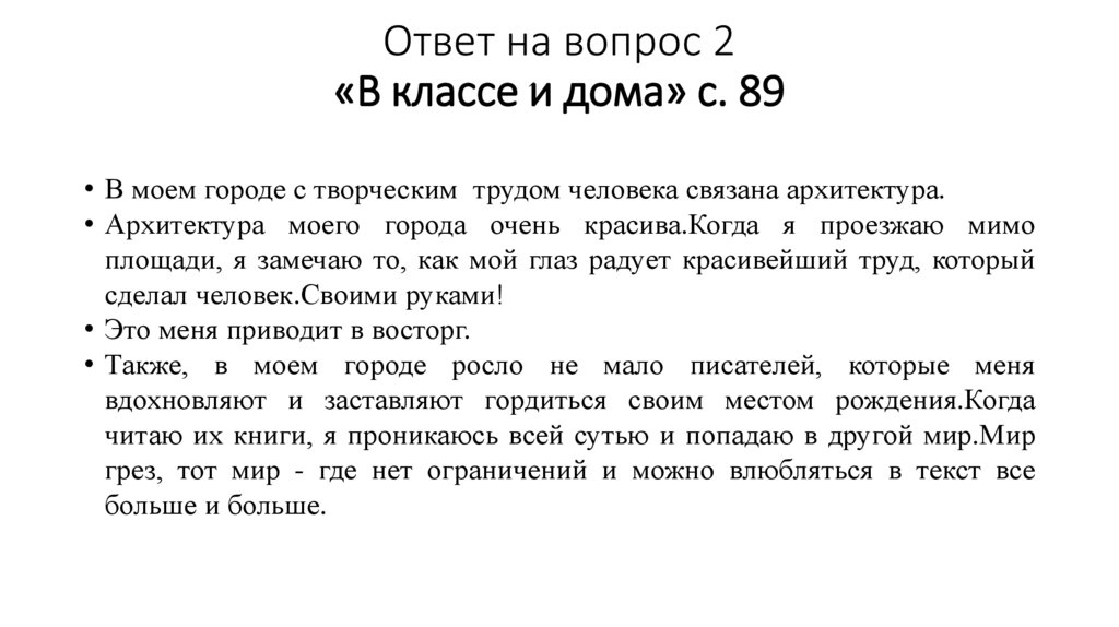 Ответ на вопрос 2«В классе и дома» с. 89