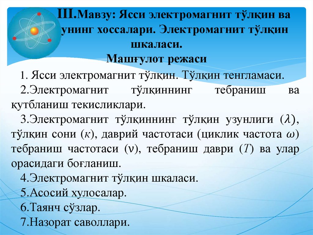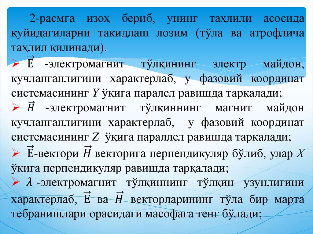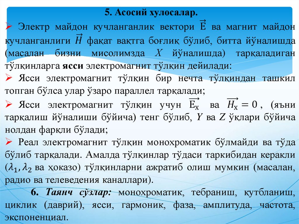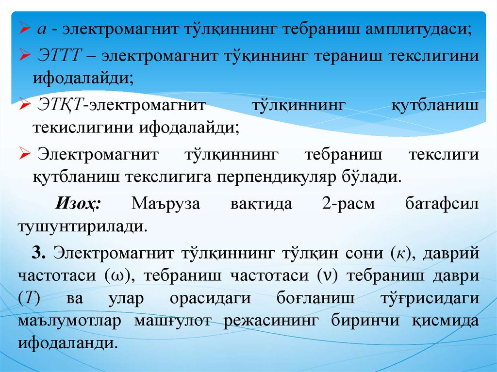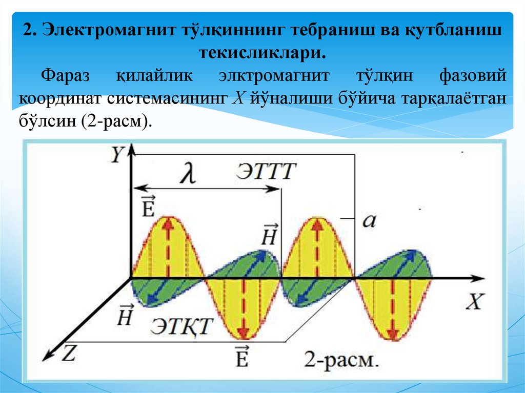 III.Мавзу: Ясси электромагнит тўлқин ваунинг хоссалари. Элeктромагнит тўлқин
