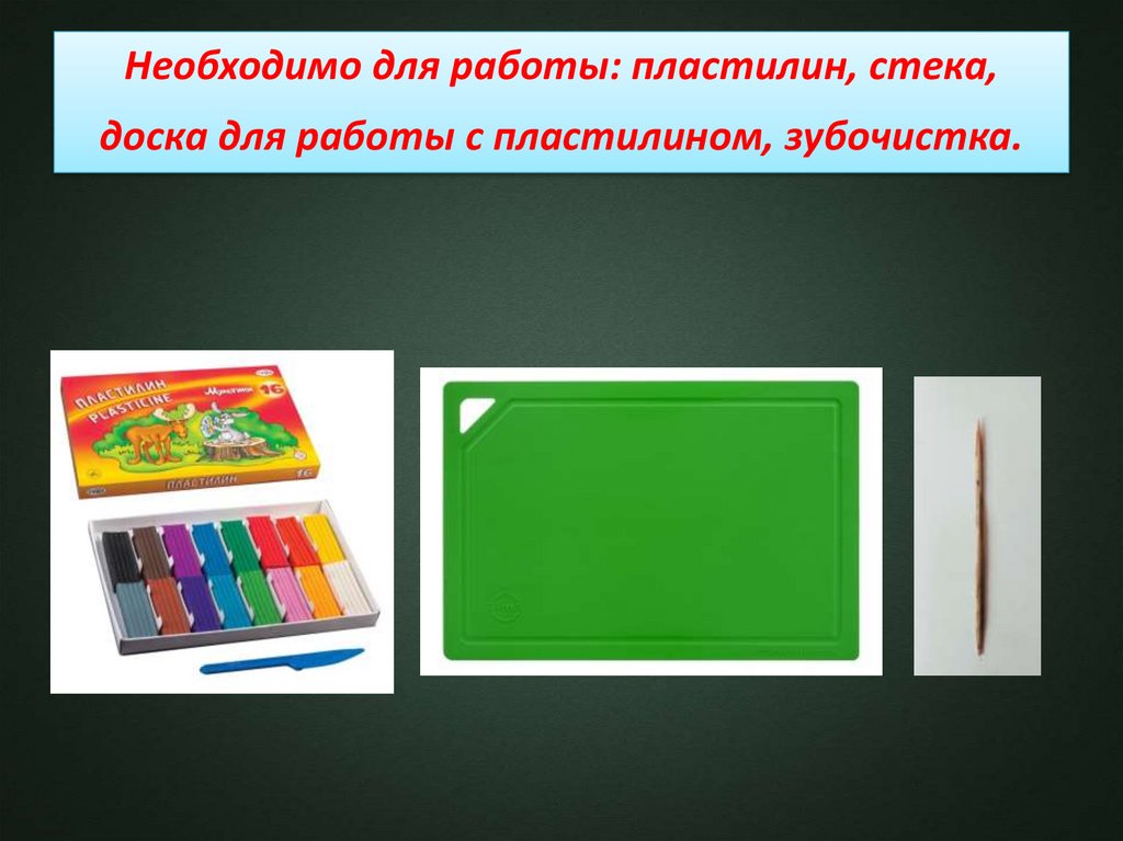 Необходимо для работы: пластилин, стека,доска для работы с пластилином, зубочистка.
