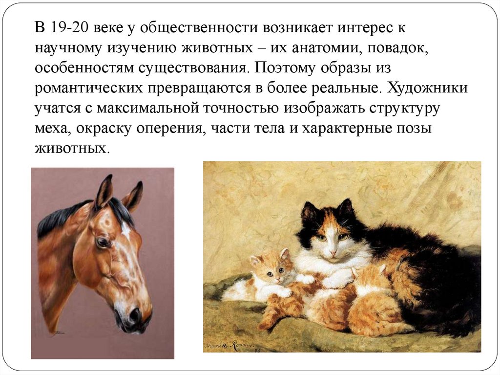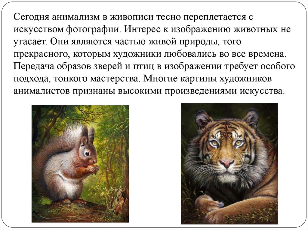 Сегодня анимализм в живописи тесно переплетается сискусством фотографии. Интерес к изображению животных не